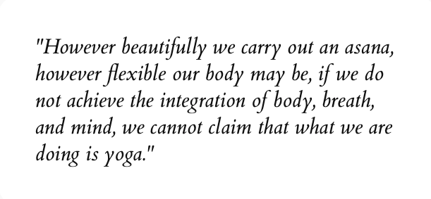 “However beautifully we carry out an asana, however flexible our body may be, if we do not achieve the integration of body, breath, and mind, we cannot claim that what we are doing is yoga.”